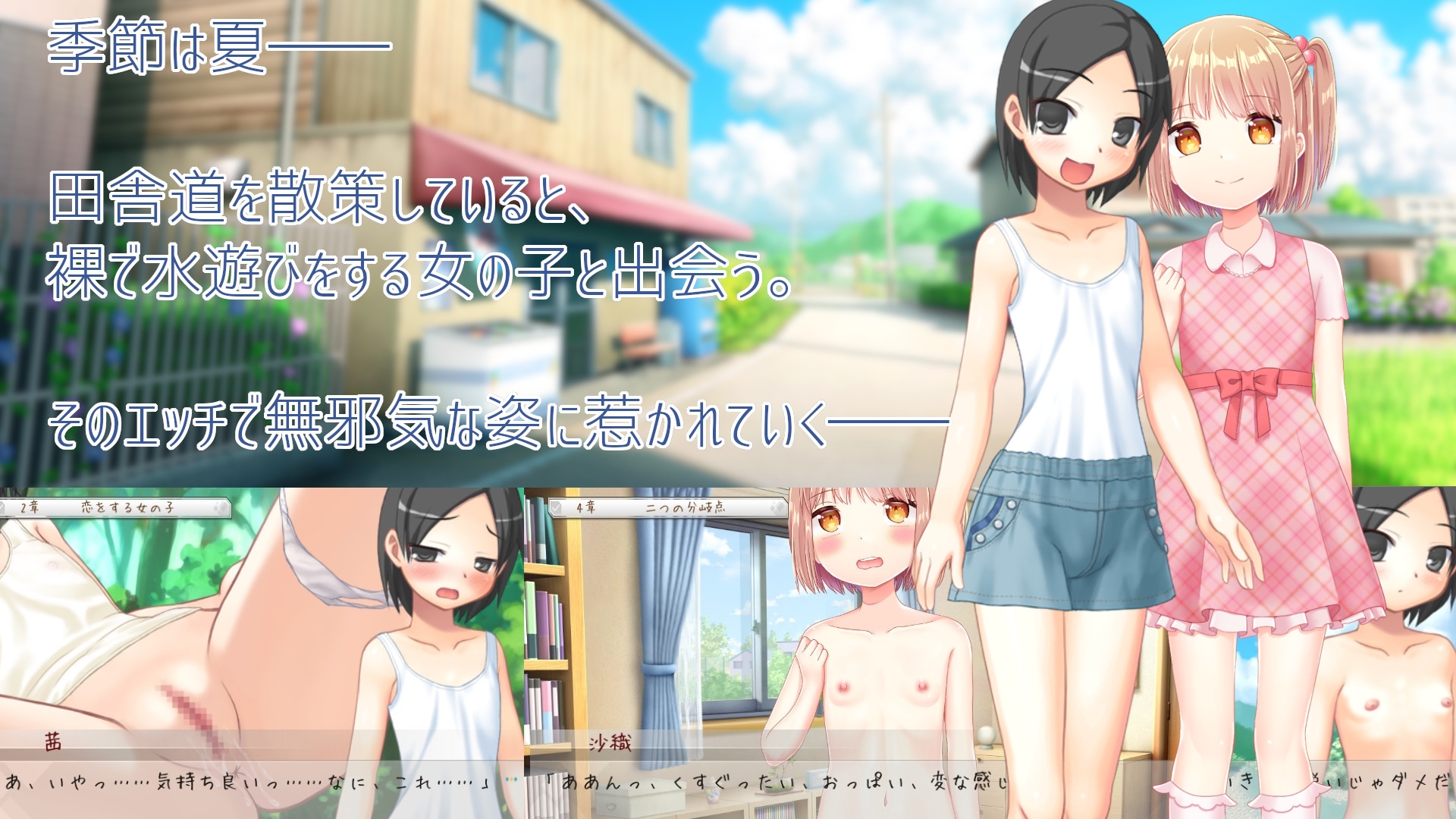 季節は夏―― ブラック企業を退職した主人公は、実家の田舎に戻ってきた。 心身共に疲れ果てた主人公が、田舎道を散策していると、河原で水遊びをする女の子と出会う。 水着も着けず、裸で水遊びをする女の子。 そのエッチで無邪気な姿に惹かれていく――
